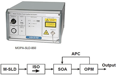 我们的MOPA-SLD-850是一种超高功率的SLD光源,具有高功率电平(10mW)和对光反馈极弱的灵敏度。是利用MOPA(主振荡器功率放大器)结构的光学方案来实现的。可参看下面的MOPA方案的简化结构图。作为主光源的中等功率SLD提供6~10mW的光功率,其相对宽的光谱为10~20 nm,中心波长850 nm。通过隔离度高于-25dB的适配的光隔离器后,通过光谱匹配的半导体光放大器将功率提高到50mW的水平。这种光学配置的主要优点是其对光反馈的敏感性较弱,因6~10mW的输入功率可使SOA达到较深的饱和水平。在这种情况下,无需在SOA的输出端安装光隔离器以防止光反馈。此外,这还可以消除与隔离器内插入损耗相关的任何不希望的功率下降,该功率下降达到2dB。MOPA方案的另一个优点是它仅使用保偏光纤而没有使用单模光纤耦合元件。大多数光纤组件都是基于快速轴截止技术构建的,该技术保证了MOPA输出较高的PER值>18dB。