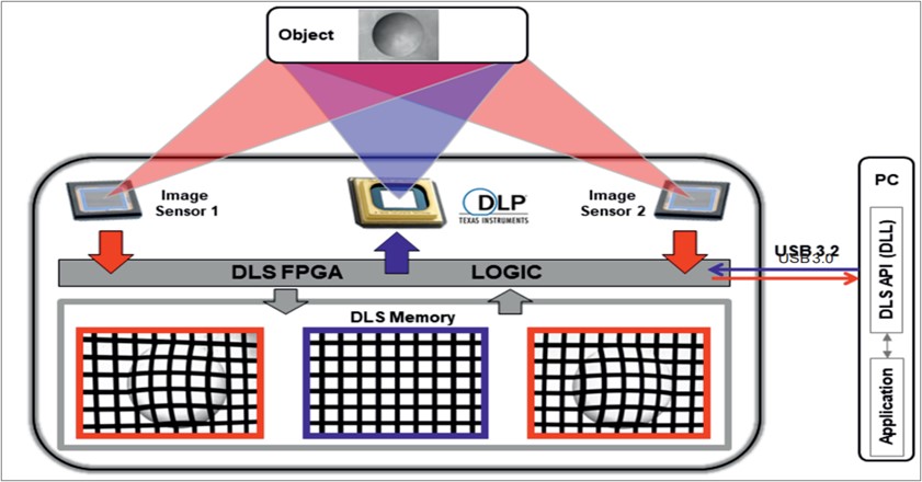3D相机的模组的架构如图所示。FGPA用于控制用于快速和精确图案投影的高性能 DLP 芯片和用于数字成像的图像传感器。图案生成和图像记录精确同步,也可以用于ROI区域数据的读出。图像传感器帧率可以从166FPS到5000FPS。一系列用户定义的投影模式可以被上传到 DLS 内存 (RAM),数据可用于单个投影或投影循环。被拍摄的物体由传感器记录,图像缓存在板载 RAM 中,该 RAM 可容纳多达 1.592 张图片(10 位,1.920 x 1.200 像素),可以被下载到 PC 进行进一步处理。所有数据流操作均由一个 FPGA 设备执行,从而实现出色的实时精度。模组通过在USB 3.2 SuperSpeed 实现与板载 RAM 之间的数据流传输。无损实时压缩进一步增强了上传功能,并且像素合并可作为图像下载的选项。