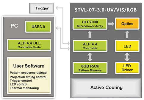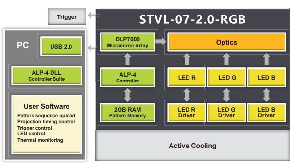 STVL-07-2.0-RGB的中央控制单元通过USB 2.0连接,实现图案上传、显示和同步。集成触发设施在其光耦接口支持宽电压范围,并且是软件可编程的。LED光源的数字驱动器可方便地访问电源设置和温度读数,以进行热管理。