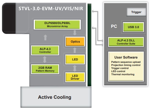 STVL-3.0-EVM-UV/VIS/NIR的中央控制单元采用USB 3.0连接,实现模式上传、显示和同步。集成触发设施在其光耦接口支持宽电压范围,并且是软件可编程的。LED光源的数字驱动器可方便地访问电源设置和温度读数,以进行热管理。
